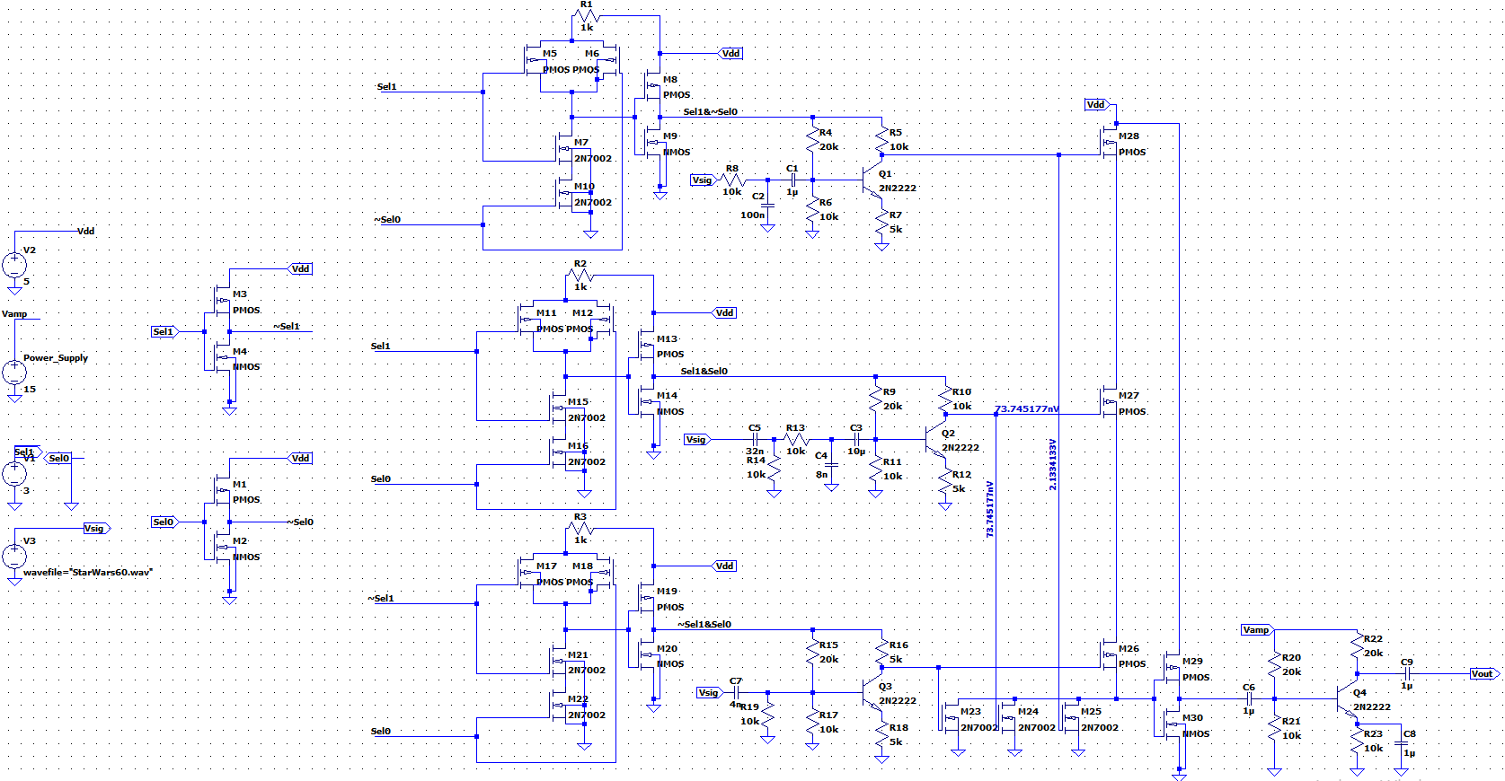 A multipurpose digitally controlled audio filter and amplifier. The design uses discrete transistors to implement multiplexers that select between low, mid, and high-pass audio filters. The filtered audio is then passed through a BJT amplifier for better gain.