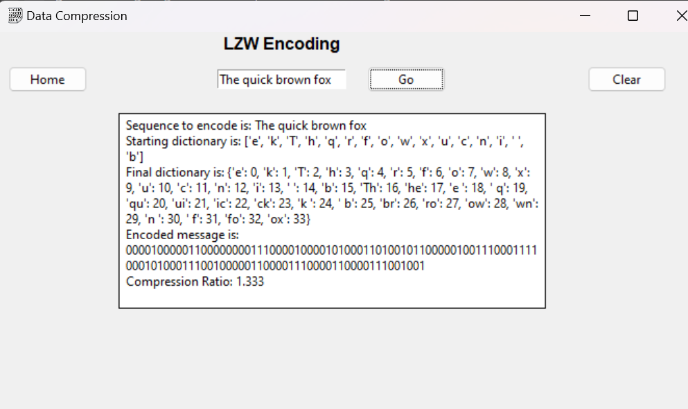 A python software application that provides demos of various compression techniques learned in CpE 405: Information Coding Systems. The algorithms demonstrated include Huffman tree construction, LZW encoding, and arithmetic coding.